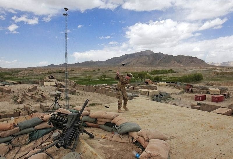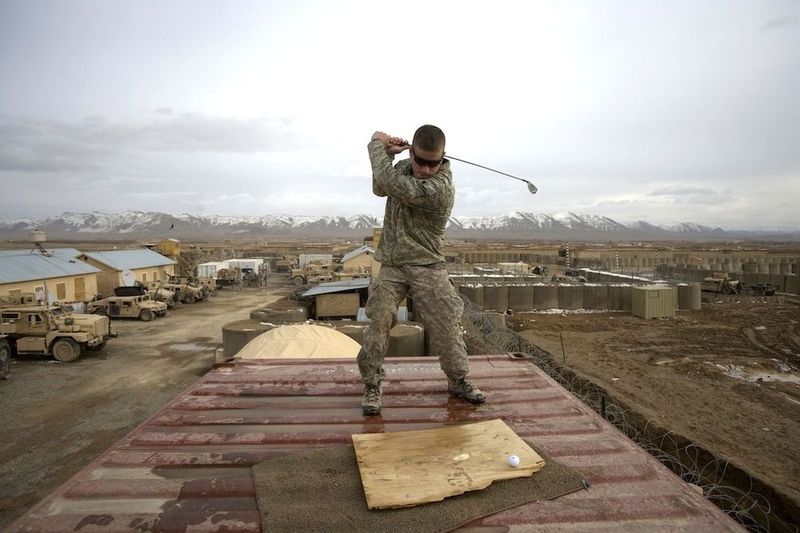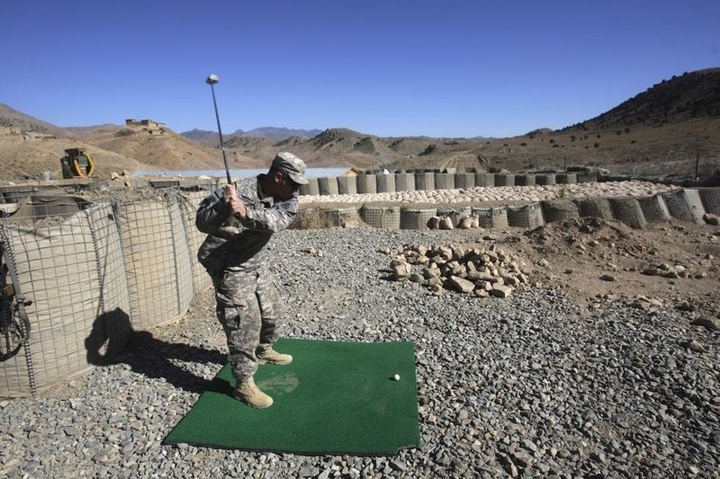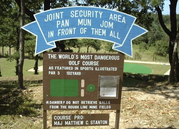 These American soldiers play golf at a desert war base (via Piximus). The final photo is from North Korea at the Camp Bonifas Golf Course—“the world’s most dangerous golf course”—where you risk the DMZ, live land mines, bunkers, wild boars, Korean tigers, vampire deer, and a mythical man-bear-pig.