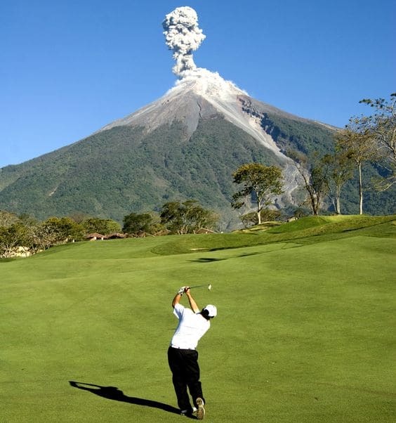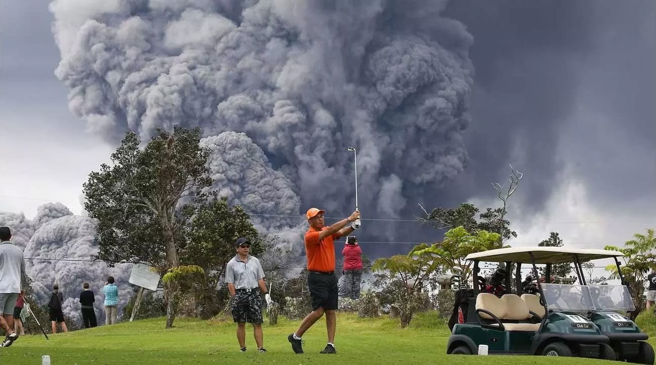 Meanwhile, in May 2018 in Hawaii, photographer Mario Tama captured images of two men playing golf in Hawaii Volcanoes National Park as massive plumes of ash from Kilauea rose behind them.